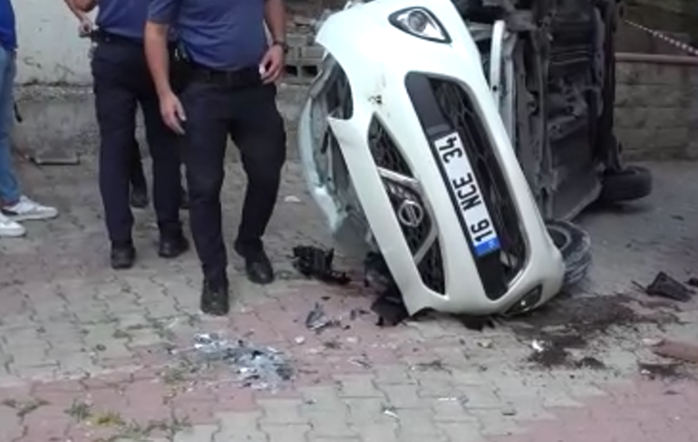 Otomobille çarpışan okul servisi apartman bahçesine uçtu 14 yaralı