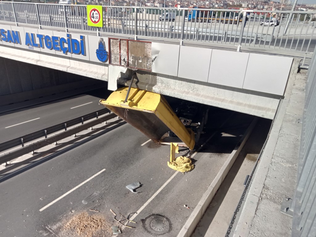 Beylikdüzünde faciadan dönüldü Açık unutulan hafriyat kamyonunun dorsesi alt geçitte takıldı