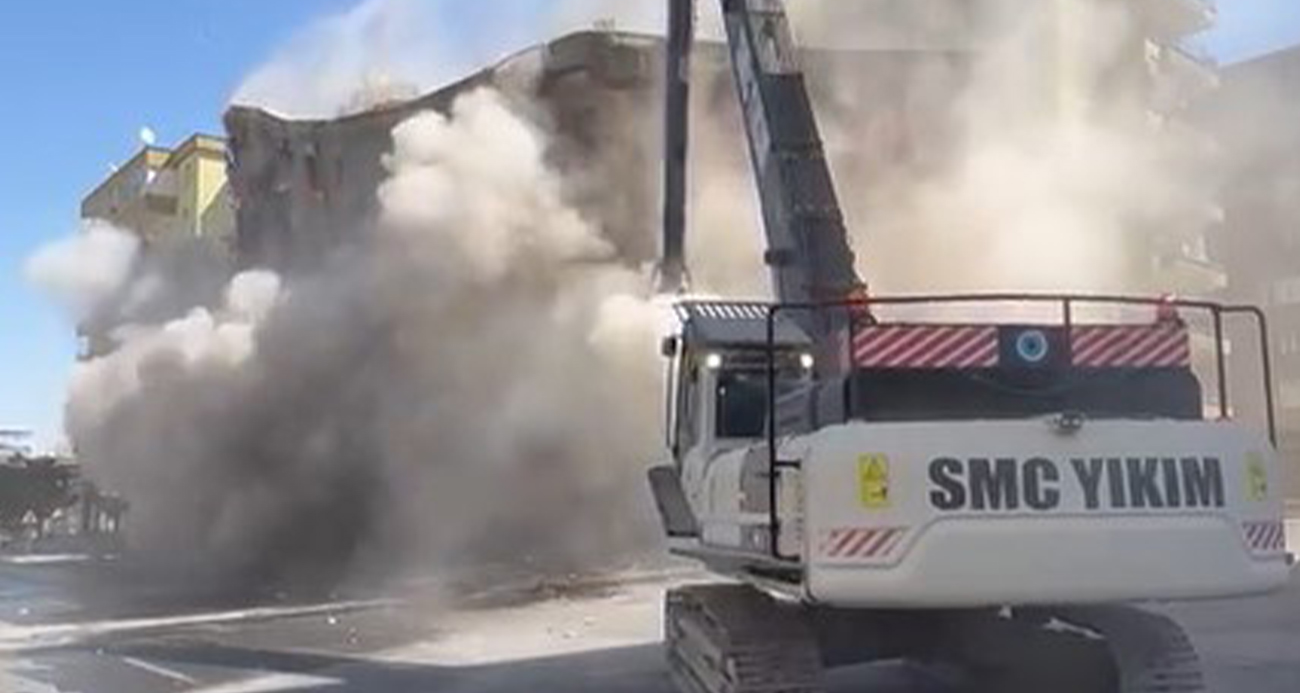Ağır hasarlı bina yıkım esnasında tek dokunuşla yerle bir oldu