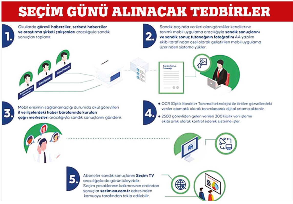 “Türkiye'de seçim sonuçlarını açıklayan merci Yüksek Seçim Kurulu'dur. Anadolu Ajansı Türk Anonim Şirketi, sandık başından topladığı kesinleşmemiş sonuçları abone/müşterilerine servis eden bir şirkettir. Bu kapsamda AA'nın seçim verilerini müşterilerine sağlıklı ve güvenilir bir şekilde servis etme sorumluluğu bulunmaktadır. AA'nın seçim verisi toplama sistemi iki ana kaynağa dayanacak.